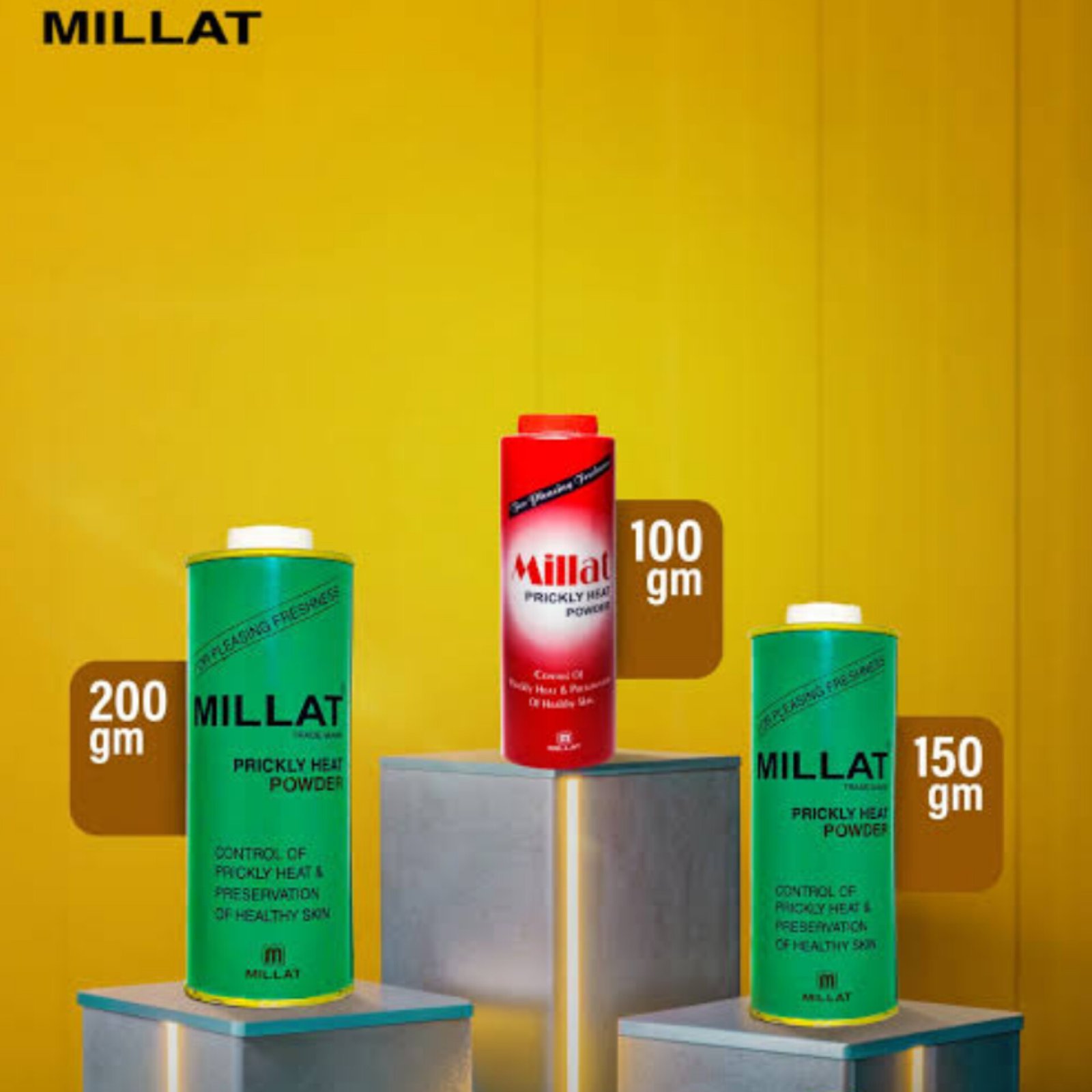 Millat Prickly Heat Powder (Millat Ghamachi Powder) বাংলাদেশের জনপ্রিয় একটি বডি পাউডার, বিশেষ করে গ্রীষ্মকালে ব্যবহারে ত্বকে স্বস্তি আনে। এটি অ্যান্টিমেডিক্যাল ফর্মুলাসহ রয়েছে, যা চুলকানি, র‍্যাশ ও অতিরিক্ত ঘাম প্রতিরোধে সহায়ক। হালকা টেক্সচার ও নিরপেক্ষ সুগন্ধের কারণে ব্যবহার আরামদায়ক এবং ত্বকে দীর্ঘসময় সতেজতা বজায় থাকে